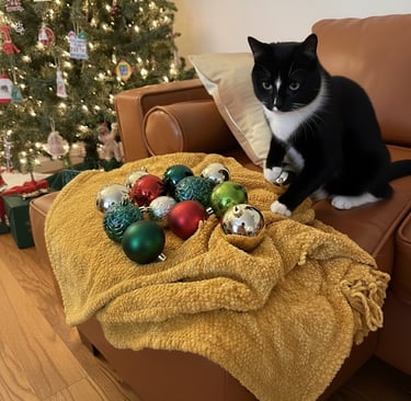 Skip the Tinsel! Or, use wide, non-string garlands (like thick fabric or wood beads). Cats find tinsel irresistible. If ingested, it can cause a "linear foreign body" obstruction that bunches up the intestines, often requiring emergency surgery.